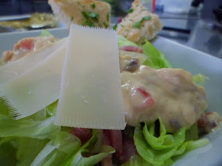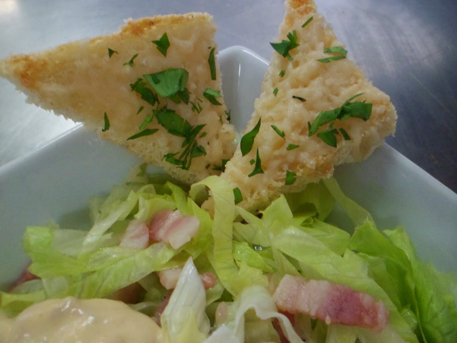 Para montar la ensalada mezclamos la lechuga escurrida con el bacon , lo ponemos en el fondo del plato, añadimos un poco de salsa por encima y decoramos con los triángulos de pan y queso. Listo para disfrutar y dejar que todos los sabores se remuevan en vuestra boca!!