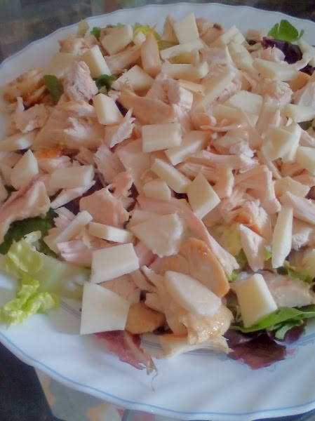 Vamos a montarla, en una fuente colocamos la lechuga, las tiras de pollo, el queso a daditos (o triangulito, como el mío), y el pan. Por último aderezamos con la salsa césar. Un consejo, aderezar en el momento de servir.