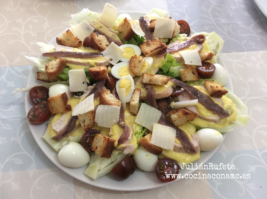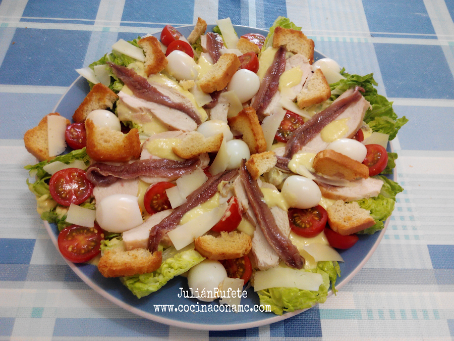 Lo primero que haremos será poner un poco de salsa donde se colocan los cogollos de lechuga, seguidamente ponemos un poco más de salsa sobre el cogollo y encima el filete de pechuga con una anchoa encima, un huevo de codorniz y dos trozos de tomate cherry junto con unos picatostes y unas lascas de queso parmesano. Podemos adornar con un poco de cebollino picado o perejil picado y unas gotas de aceite oliva virgen extra.