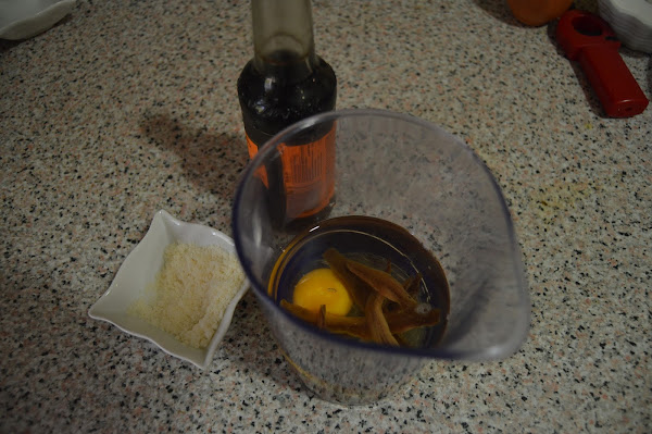 Echamos en el vaso de la batidora el aceite de girasol, huevo, zumo de medio limón, unas gotas de lea perrins, una pizca de sal, las 7 anchoas y el queso parmesano al gusto.