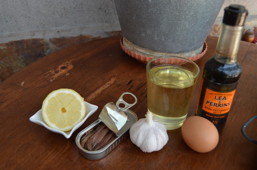 Se prepara igual que una mayonesa, añadiendo las anchoas, el ajo y la salsa perrins.
