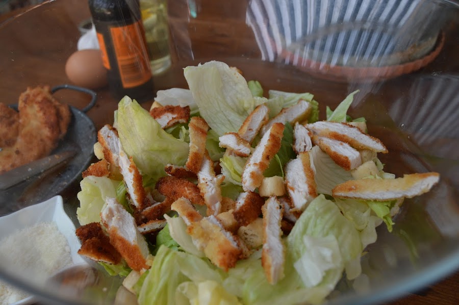 En la ensaladera mezclamos la lechuga con los trocitos de pan tostado, la pechuga (cortada en tiras) y espolvoreamos un poco de queso de parmesano y una pizca de sal.
