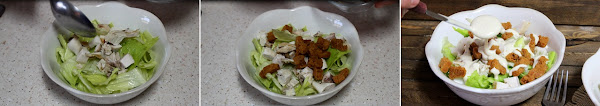 Lavamos y picamos la lechuga en trozos medianos, la ponemos en un bol y le añadimos el pollo troceado, los picatostes y la salsa César.