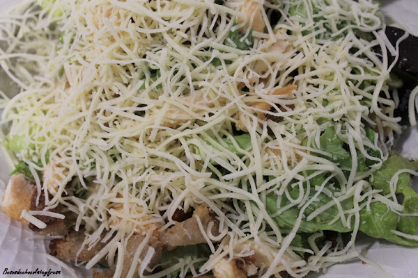 Espolvoreamos queso rallado por encima y la salsa césar. Removemos de nuevo bien para que se unan todos los ingredientes.