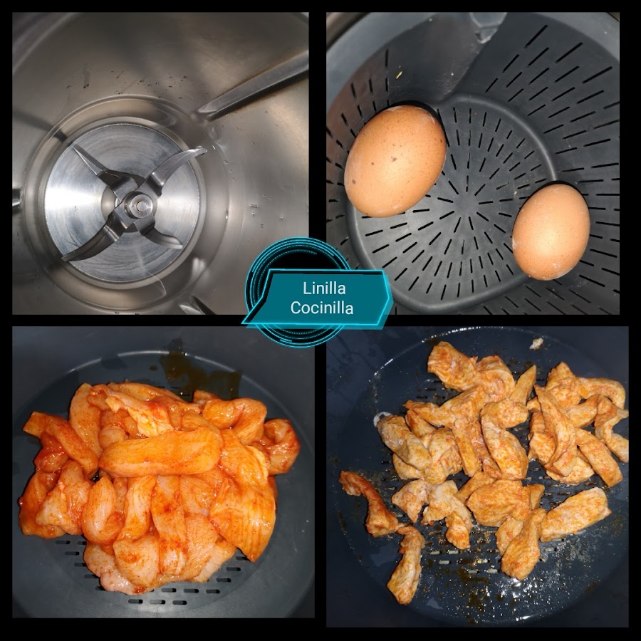 1. Ponga un bol sobre la tapa del vaso y pese el pollo. Añada el pimentón, la sal y el aceite. Mezcle bien y reserve.