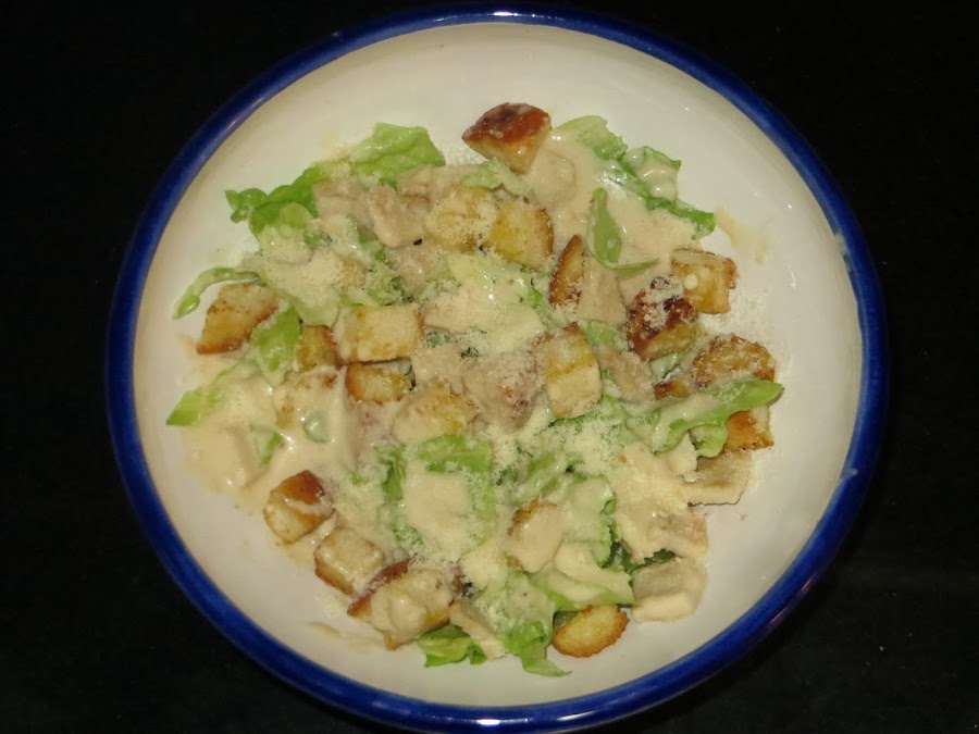 Ahora colocáis en el fondo de la ensaladera la lechuga, encima los trozos de pollo y los picatostes, el parmesano que puede ser en trozos o rallado y le añadís bastante salsa César y ya tenéis vuestra ensalada lista para comer.