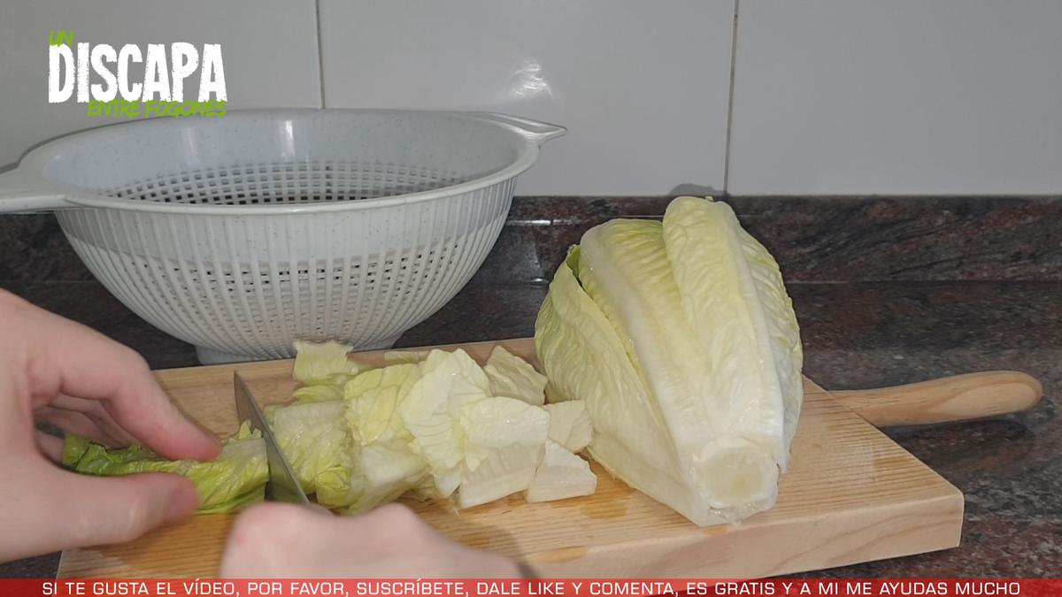2Aquí tengo una lechuga romana que es la lechuga que se suele utilizar para hacer esta ensalada. Le quitamos el culo y las hojas exteriores. Ahora troceamos las hojas y las vamos dejando en un colador o escurridor. Una vez que hemos troceado toda la lechuga, la pasamos por agua y la escurrimos.