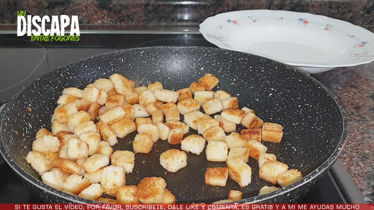 3Después, en una sartén añadimos un chorrito de aceite y dejamos que se vaya calentando. Mientras se calienta el aceite, vamos a cortar unos cubitos de pan de molde, yo estoy utilizando pan de molde, pero vosotros podéis usar el pan que queráis. Cuando el aceite ha cogido temperatura añadimos los cubitos de pan y a fuego medio dejamos que se vayan dorando, con cuidado de que no se quemen. Cuando ya se tostado los reservamos en un plato.