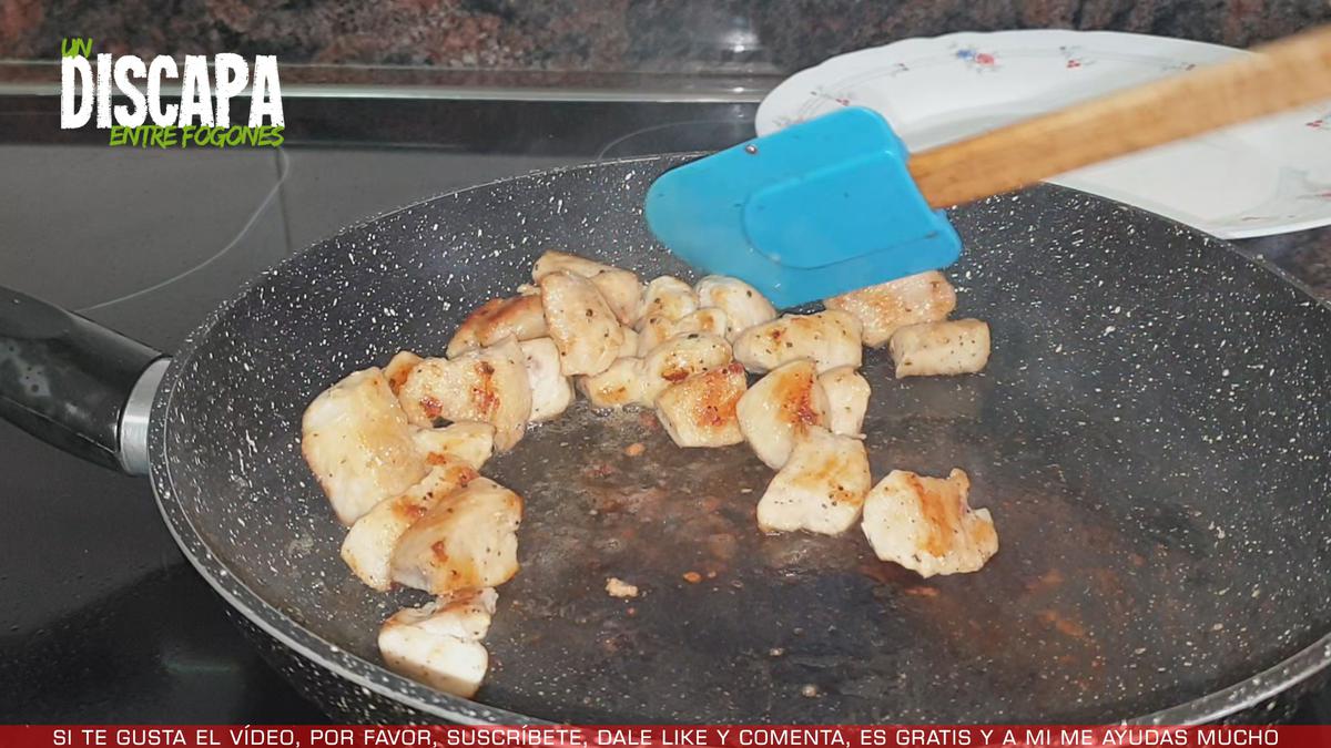 4Volvemos a añadir un chorrito de aceite en una sartén y dejamos que coja temperatura. Aquí tengo una pechuga de pollo, la troceamos en trozos medianos, más o menos de bocado, le añadimos sal y pimienta al gusto y lo añadimos a la sartén. Y a fuego medio dejaremos que se vayan dorando. Y una vez dorados, los reservamos en un plato.