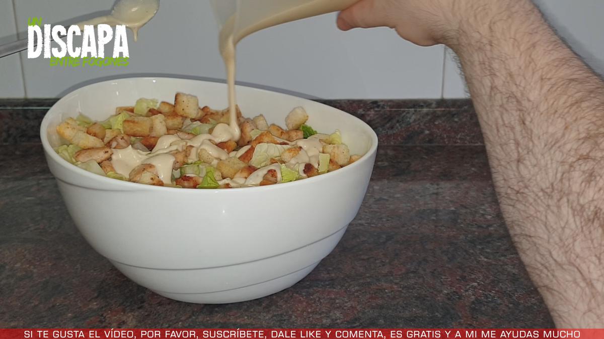 5Ahora ya solamente falta montar la ensalada. Añadimos la lechuga ya limpia en un recipiente amplio, añadimos el pollo troceado y los cubitos de pan. Os recomiendo que si no vaís a comer la ensalada inmediatamente, el pan lo añadáis en el momento de comer la ensalada porque si no, el pan se os quedará blando y perderá todo el crujiente. Añadimos la salsa sobre la ensalada. Y por último, añadimos unas lascas de queso parmesano.