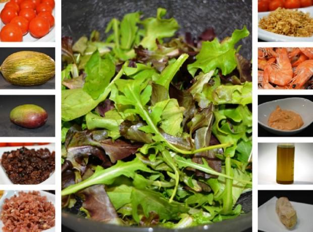 Realmente, hacer esta ensalada completa no tiene ningún misterio, básicamente consiste en ir poniendo todos los ingredientes de una forma curiosa y viendo el vídeo creo que se puede conseguir con excelente resultado; pero por si acaso, lo voy a poner por escrito, porque siempre hay personas que lo agradecen. Lo primero que hay que hacer en esta ensalada completa, es aliñar las lechugas variadas. Primero con sal, luego con vinagre balsámico de manzana y finalmente con aceite de oliva, para luego removerlo todo y que quede el aliño bien integrado con la lechuga. Luego añadimos las uvas pasas, el jamón y la cebolla crujiente, y volvemos a remover. Lo siguiente que tenemos que hacer, es pelar el mango y quitar el hueso. El mango tiene un hueso plano y alargado, por lo que hay que hacer dos cortes (y esto lo vais a ver mucho mejor en el vídeo) más o menos por el centro, para que salga entero. Luego lo troceamos en taquitos y reservamos. Ahora viene el melón y lo que he hecho con él, es sacar unas bolas con un utensilio muy útil para este cometido. Si no lo tenéis podéis cortar un par de catas y trocearlas, no tiene mucha importancia para la ensalada completa. Ahora solo nos queda poner todos los ingredientes en el recipiente final para rematar la ensalada completa. Disponemos la lechuga con sus tropezones en el bol y luego vamos poniendo los trozos de mango, los langostinos cocidos (previamente pelados, por supuesto), unos tomates cherry cortados por la mitad, las bolitas de melón, la salsa rosa y para rematar, rallamos (solo si tenéis) un poco de foie fresco por encima de la ensalada completa.