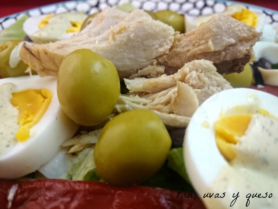 Como volver a preparar mi plato no tenía sentido ;) elegí la ensalada. Con algún cambio, ya que no puse la zanahoria, la cebolla ni el maíz que ella incluye. Además, la aliñé con parte de la mayonesa de hierbas que había preparado para los espárragos rellenos de crema de salmón