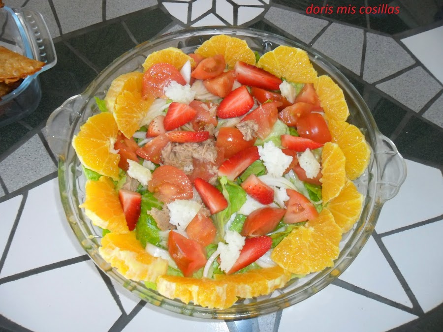 Acomodamos en una fuente de cristal preferentemente y aliñamos ligeramente con aceite de oliva virgen extra, vinagre y un poco de sal y removemos.
