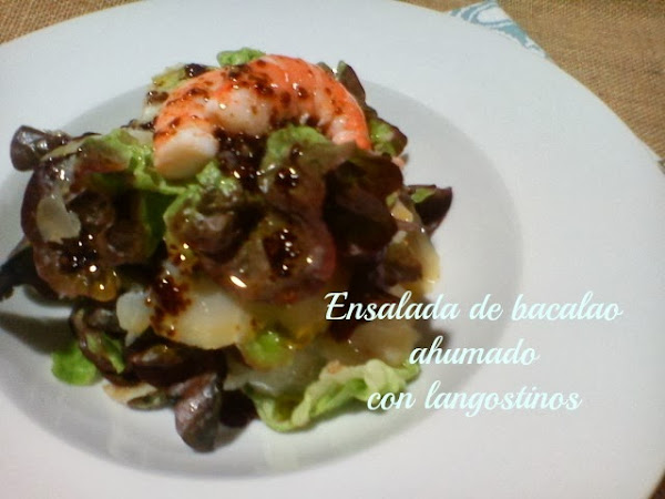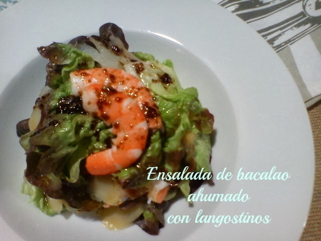 Colocamos unas hojas de brotes en la ensaladera continuación el bacalao ahumado.