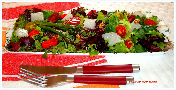 Las ensaladas, en general, no tienen mucho misterio. El secreto está en elegir productos muy frescos y saberlos combinar de tal manera que la mezcla resulte sabrosa. Si se aliña con acierto y de forma generosa puede ser un plato de 10. Esta receta la vi en la revista de cocina "Cuina", pero no es la primera vez que pongo bacalao o espárragos en la ensalada, aquí podéis ver una con pollo súper buena. Y aquí otra con bacalao y naranja.