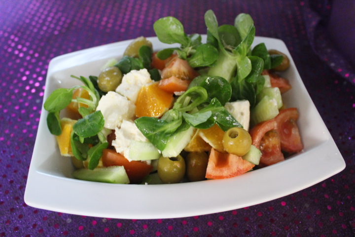 Añadimos al queso, el pepino, la naranja, los canónigos, las aceitunas y el tomate.