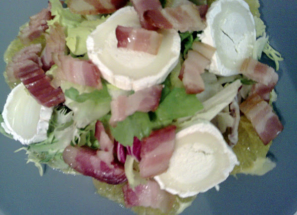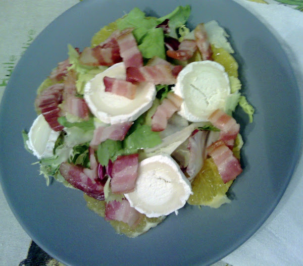 Pelamos la naranja y la cortamos en rodajas finas, con las rodajitas cubrimos un plato llano, encima de estas ponemos un buen monton de hojitas de lechuga. Cortamos el bacon en tiras y lo freimos, en mi caso para que tenga menos calorias lo que hago es ponerlo en un cuenquito en el microondas y luego escurrirle bien el aceite que suelta. Partimos el queso rulo en rodajas (tantas como comensales) y las ponemos por encima de nuestra lechuga estrategicamente. Echamos ahora el bacon por encima, en este punto podeis añadirle tambien unos frutos secos, yo no lo he hecho porque tenemos alguna alergia en casa. Para hacer la vinagreta ponemos una cucharada sopera de aceite, una pizca de sal, un chorrito de vinagre balsámico y un par de cucharaditas de mermelada de frambuesa y removemos bien. Bañamos nuestra ensalada con la vinagreta.