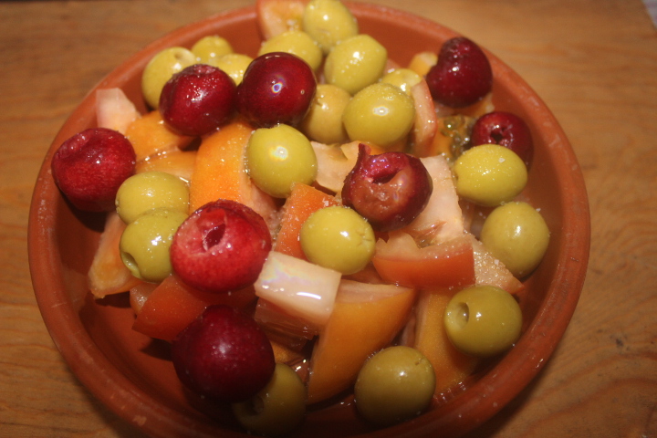 Sobre el tomate colocamos las aceitunas.
