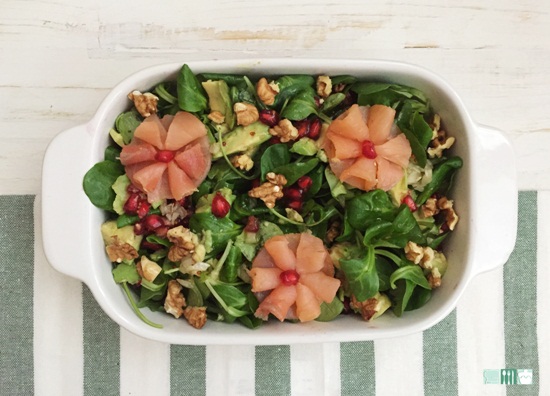 Ya en el Calendario de Adviento del año pasado puse ensaladas, como ésta de este enlace, porque no todo son turrones y menús copiosos, también hay día de trabajos y necesidad de comer un poco mas ligero; Aún así la visto con los colores de Navidad, rojo (granada), verde (aguacate, canónigos y rúcula)