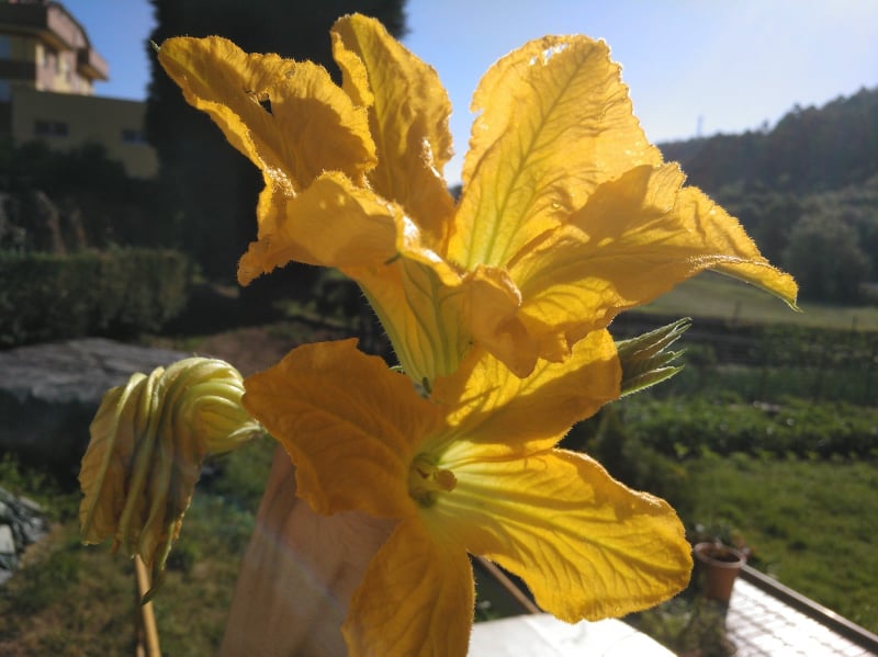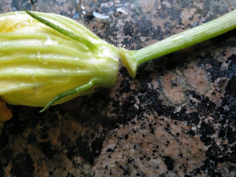 Cuando ya tengamos los calabacines en flor, veremos que hay dos tipos de flores, las hembras, que tienen el calabacín pegado, y las macho que tienen tan solo un tallo. Para esta receta, utilizaremos flores macho.