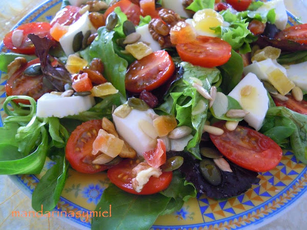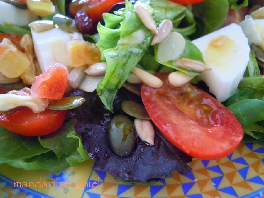 Es una ensalada crujiente y llena de contrastes, el dulzor de las frutas confitadas con los piñones, pipas, nueces.....