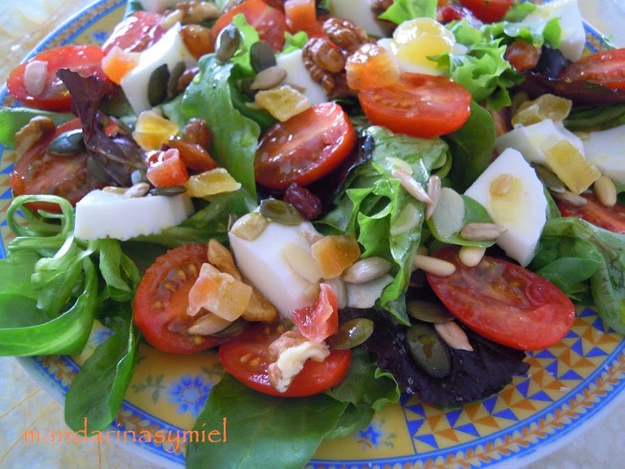 Hoy os voy a poner una ensalada de brotes tiernos con frutos secos, frutas confitadas y queso fresco.