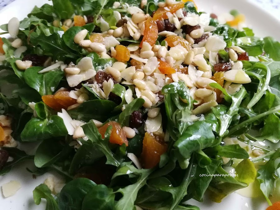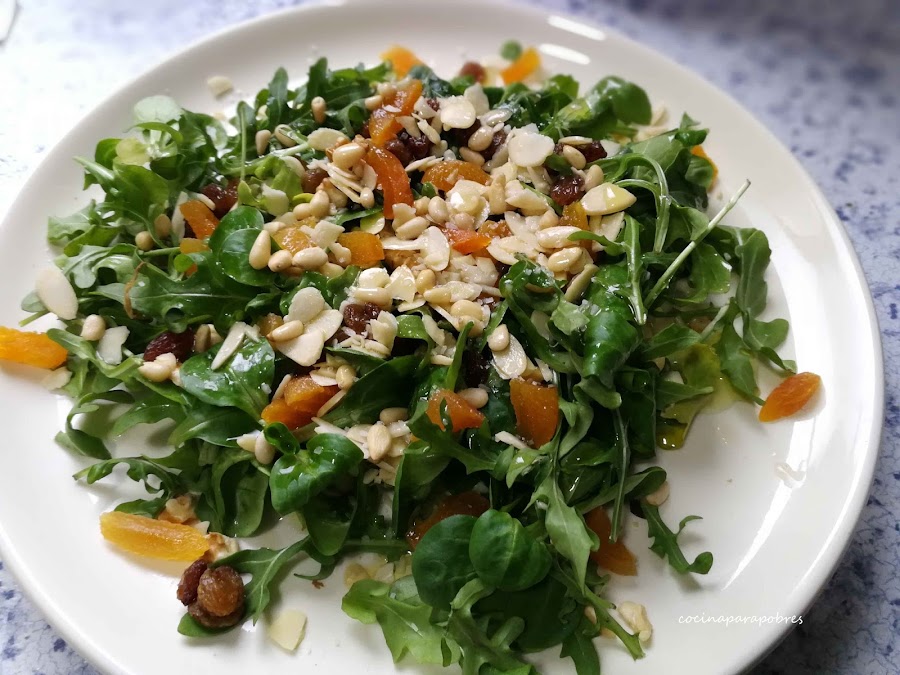 aceite de oliva virgen extraLavamos los canónigos y la rúcula, escurrimos y ponemos en una fuente, añadimos los frutos secos, los orejones lo troceamos antes de añadirlo, aliñamos a gusto y listo.
