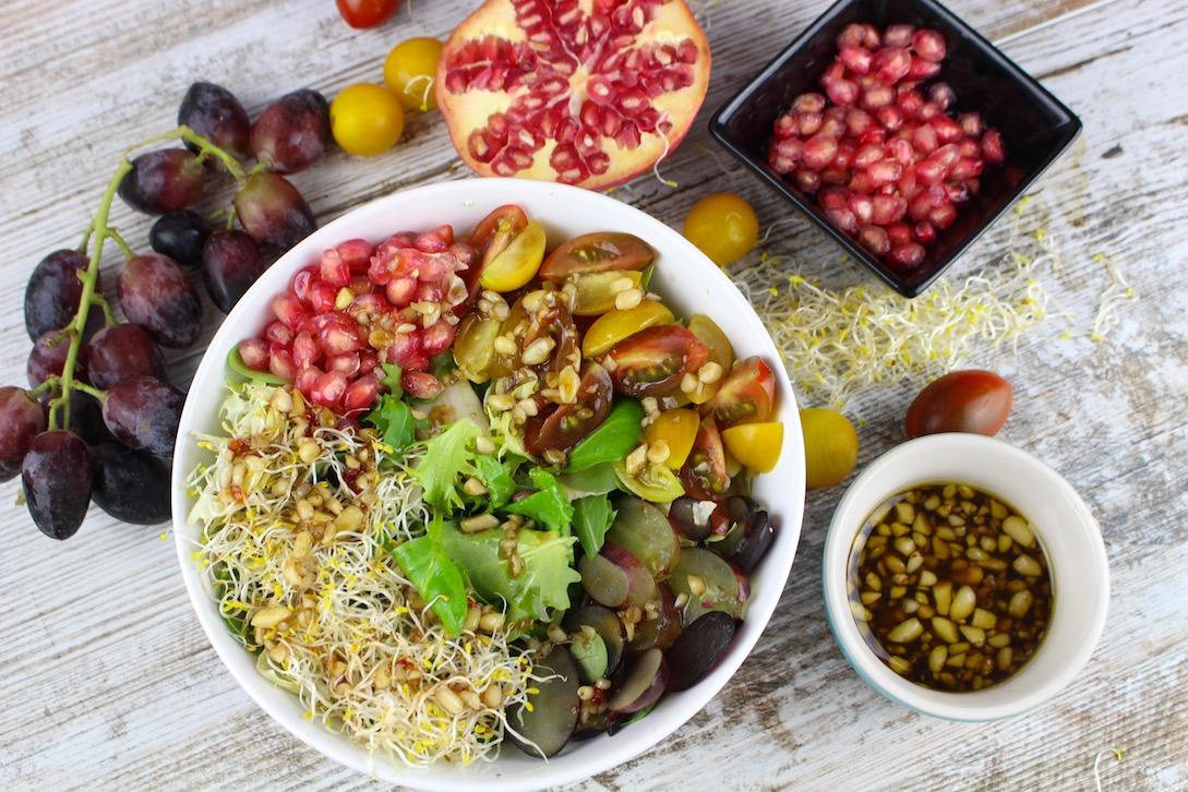 Colorida ensalada de germinados de alfalfa, kale, granada, uvas, cherrys y vinagreta agridulce y picante