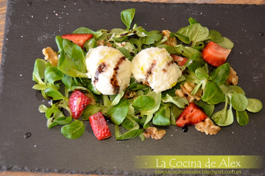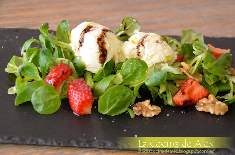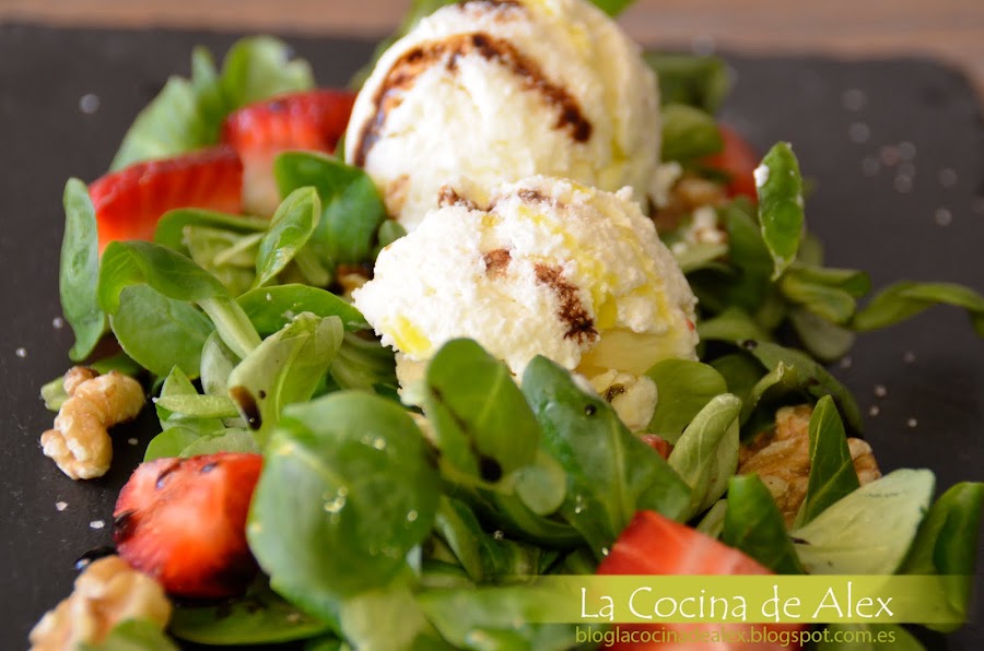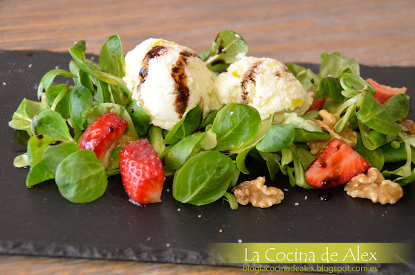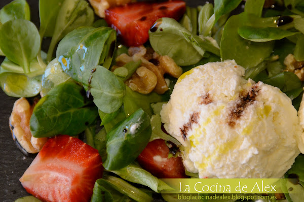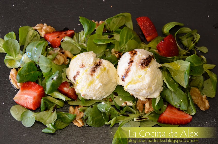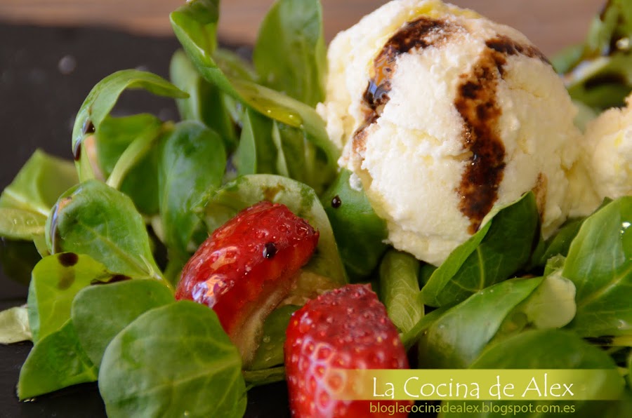 Para la presentación final solo queda montar la ensalada poniendo en el fondo los canónigos, ponemos las fresas, las nueces troceadas, dos buenas bolas de helado de queso crema y terminamos con un chorrito de crema de vinagre y aceite de oliva.