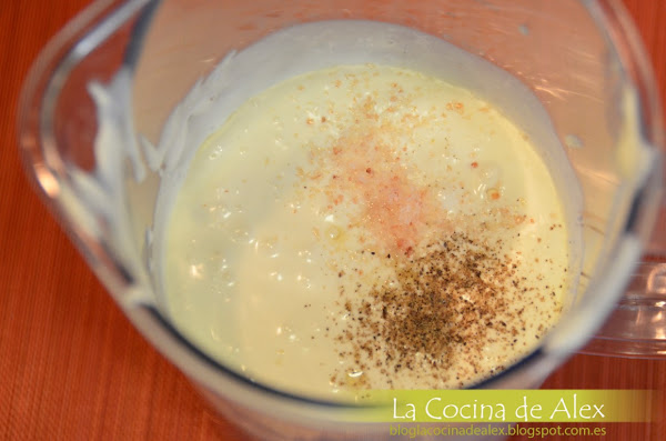 En el vaso batidor ponemos la nata (crema de leche), el queso crema, la mezcla anterior, escamas de sal rosa y pimienta. Trituramos hasta que la mezcla se homogenea.