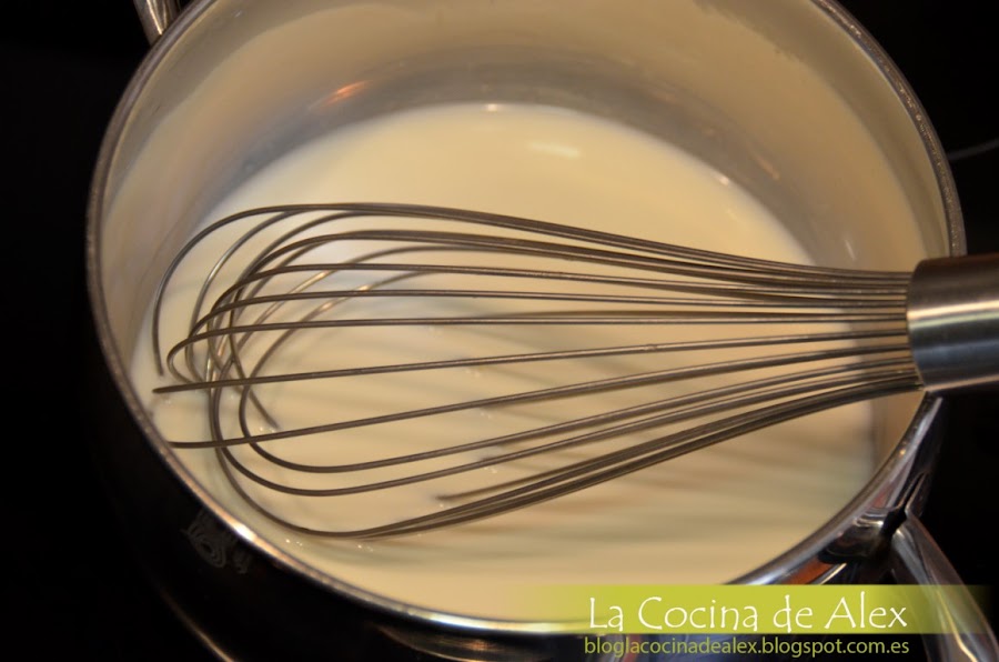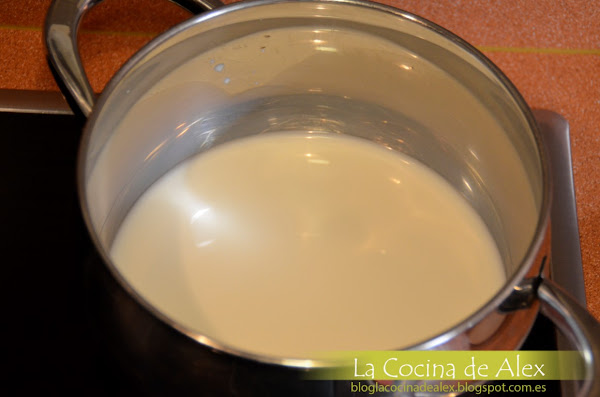 En un cazo calentamos la leche hasta que se temple, añadimos la gelatina y removemos hasta que se disuelva todo bien. Retiramos del fuego.
