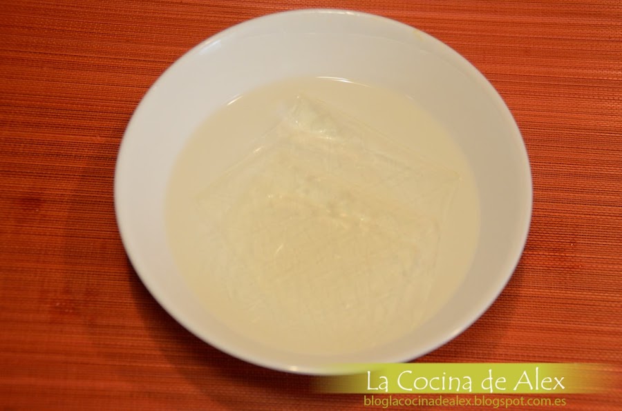 PREPARACIÓN:Lo primero que tendremos que hacer con un poco de antelación sera el helado de queso crema para que de tiempo a que cuaje en el congelador. Para ello, lo primero que hacemos es poner a hidratar en agua las hojas de gelatina.