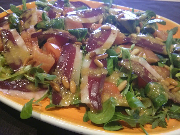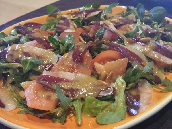 Uy que rica ensaladita! ésta es con rúcula y canónigos, pero con espinacas frescas también está que te caes de buena! Vamos al lio