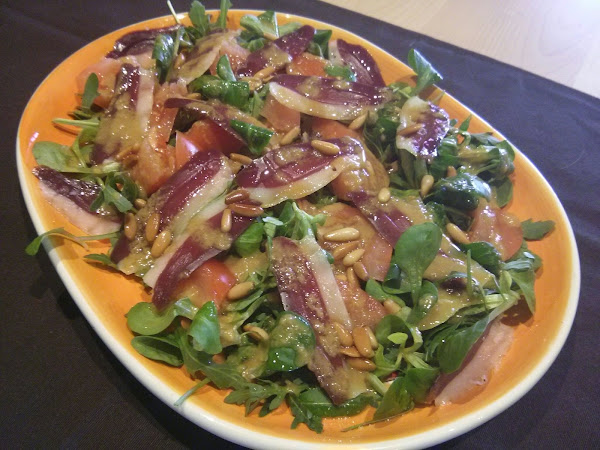 - Disponer todos los ingredientes de la ensalada en una ensaladera, echar los piñones por encima, y la vinagreta. Remover bien y servir.