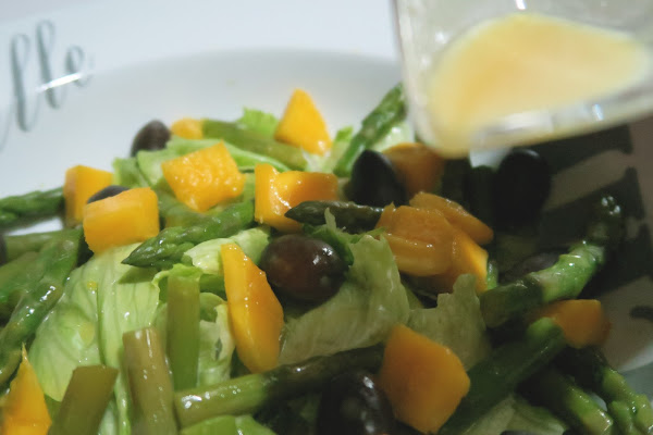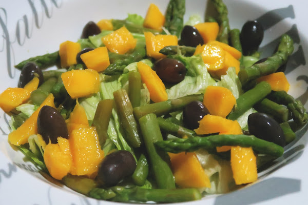 Lavar y picar las hojas de lechuga y ponerlas en el plato en que se servirá. Cortar los espárragos y añadirlos junto con el mango picado en cubos y las aceitunas.