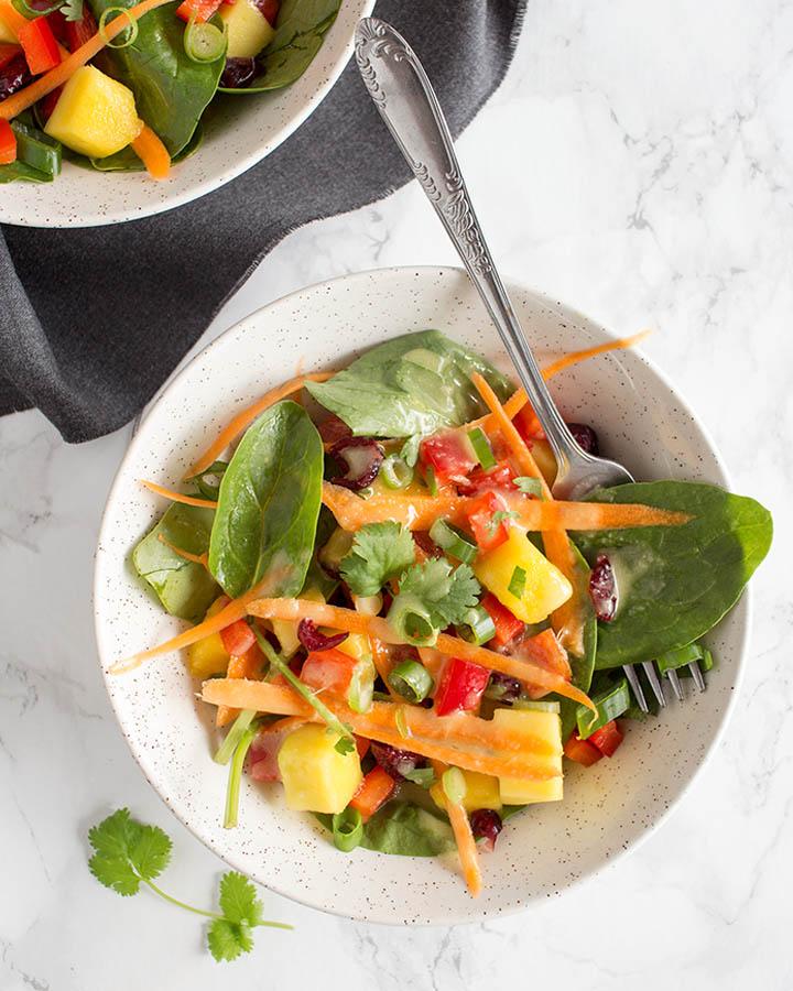 Hace unas semanas quedamos encantados con esta ensalada de mango y espinacas. La combinación de ingredientes le da un aire thai riquísimo y veréis que se nota todavía más cuando le añadáis el aderezo de jengibre y limón.
