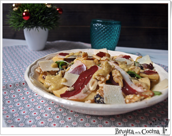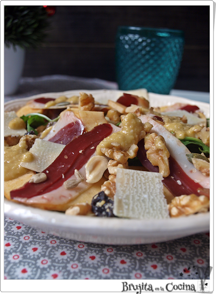 Para montar la ensalada colocamos una base con el mix de lechuga, colocamos manzana, distribuimos frutos secos y el jamón de pato.