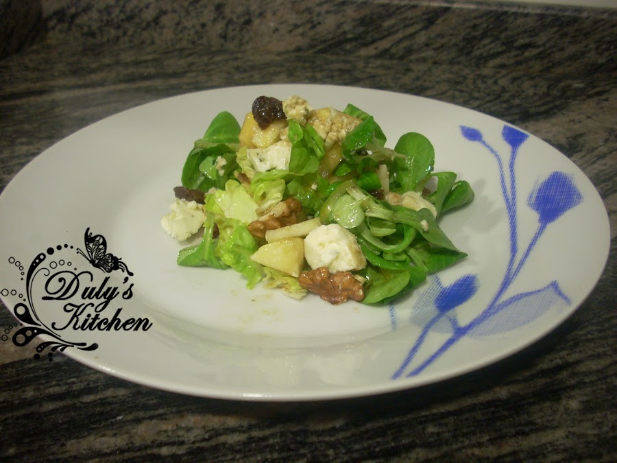 Es una ensalada variada porque mezcla lechuga, canónigos entre otros ingredientes. La cantidad de queso azul la dejo al gusto porque al ser tan intenso tal vez queráis ponerle un poco menos, en casa no nos desagrada en absoluto así que echamos bastante.