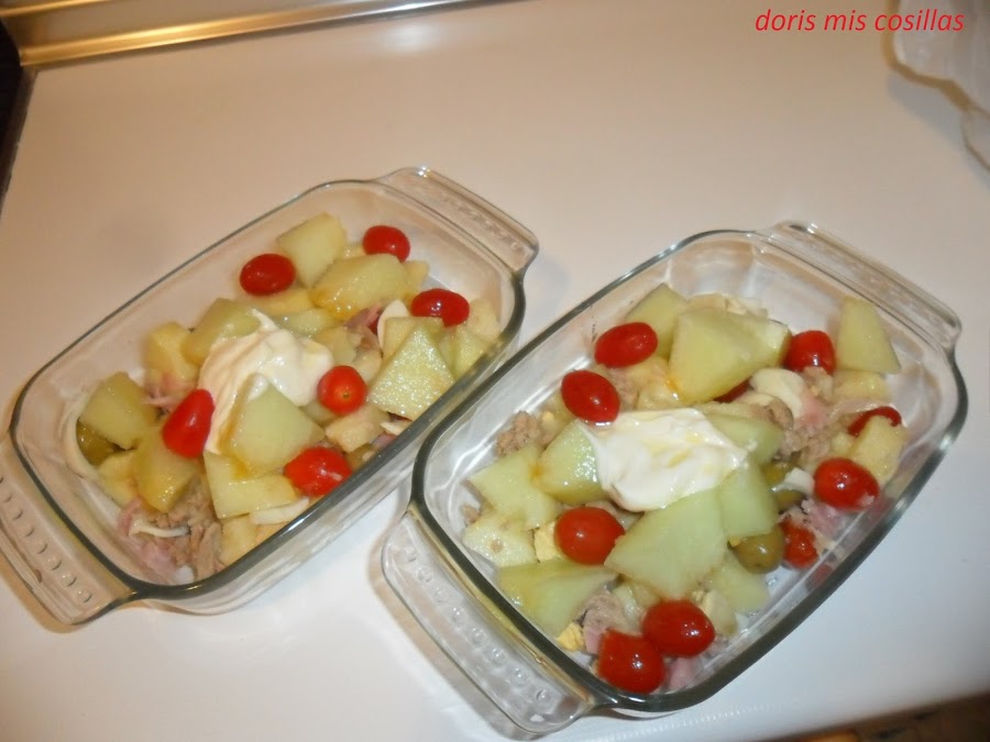 Rociamos un hilo de aceite de oliva virgen extra y un poco de sal, removemos con cuidado y dejamos enfriar en la nevera.En el momento de servir, ponemos mayonesa ligera en mi caso industrial y ya la tenemos.