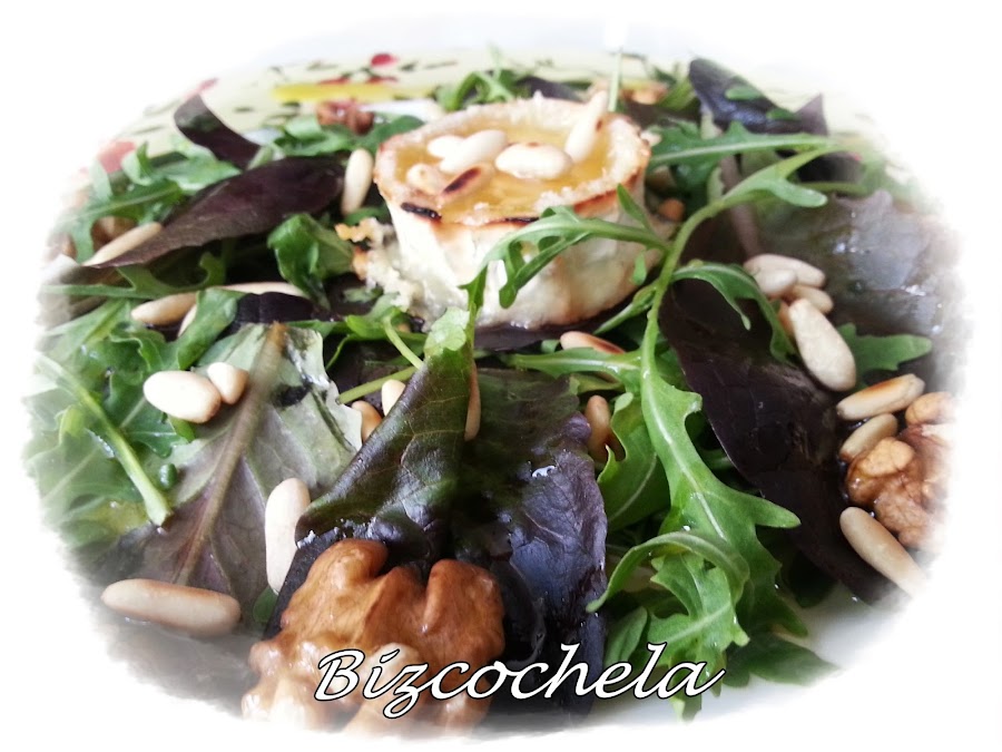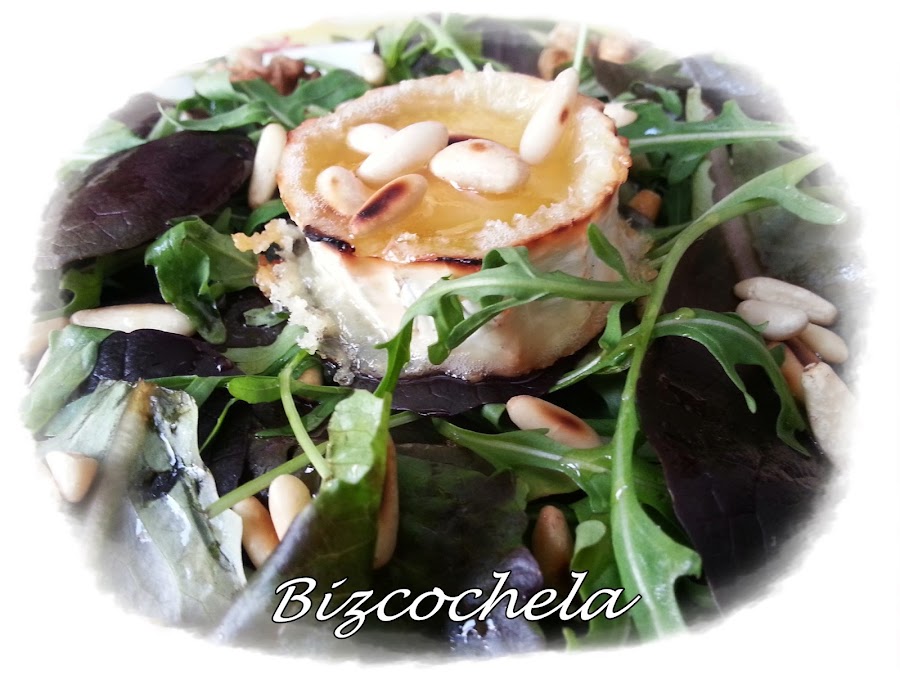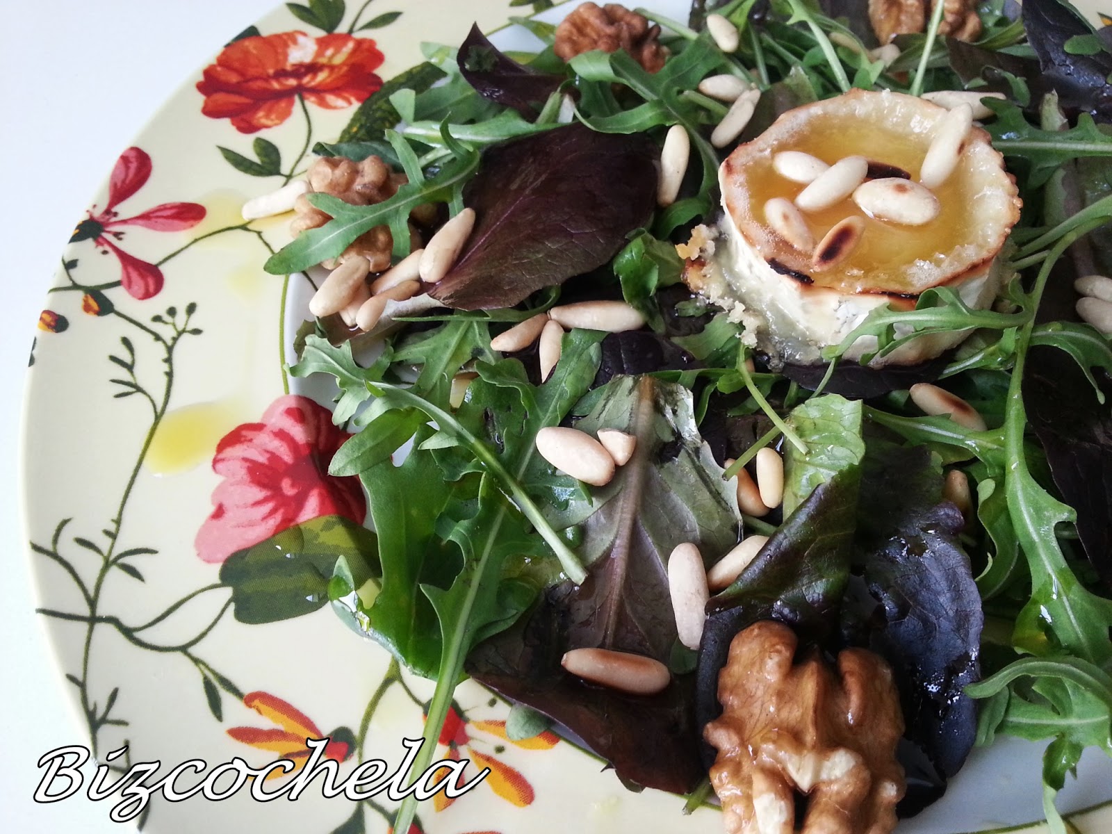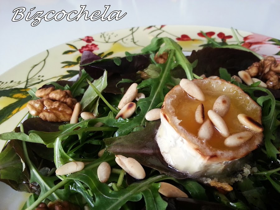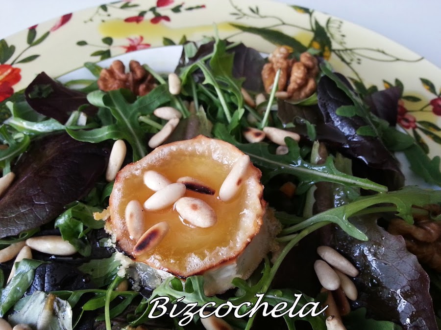3. - En una fuente disponemos las lechugas, ponemos la nueces troceadas y los piñones. Y metemos el queso en el horno en la zona más alta para que se gratine rápidamente, en 3 minutos estará listo.