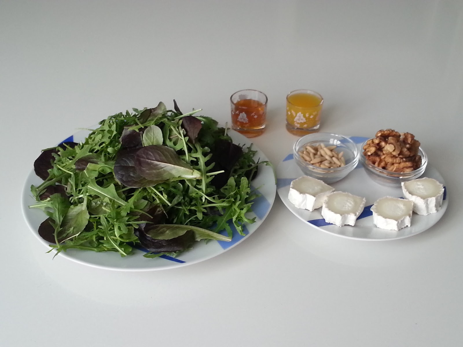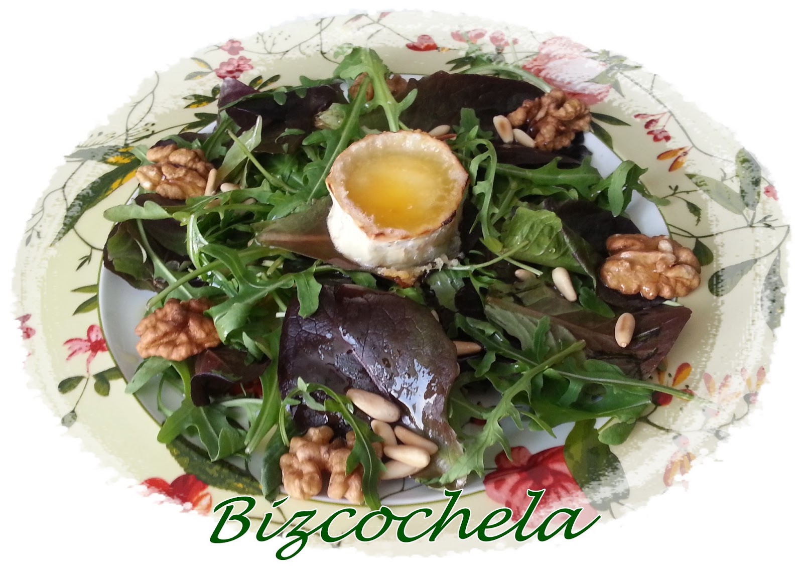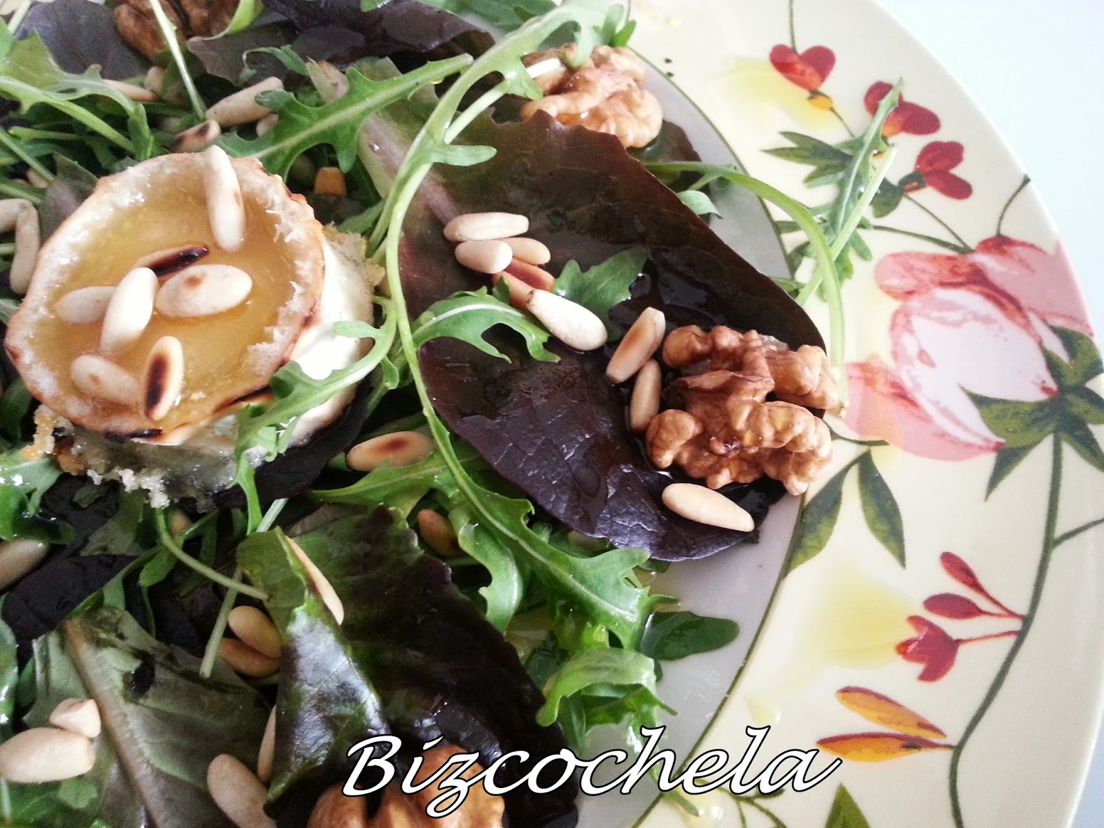3. - En una fuente disponemos las lechugas, ponemos la nueces troceadas y los piñones. Y metemos el queso en el horno en la zona más alta para que se gratine rápidamente, en 3 minutos estará listo.