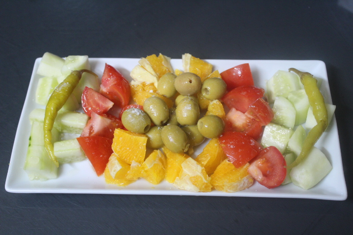 Colocamos los daditos de naranja en el centro del plato donde serviremos, dejando el centro libre, para colocar en el, las aceitunas.
