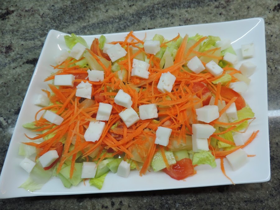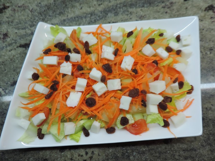 Lo echamos encima de todo y lo aliñamos con aceite de oliva, vinagre de manzana y sal.