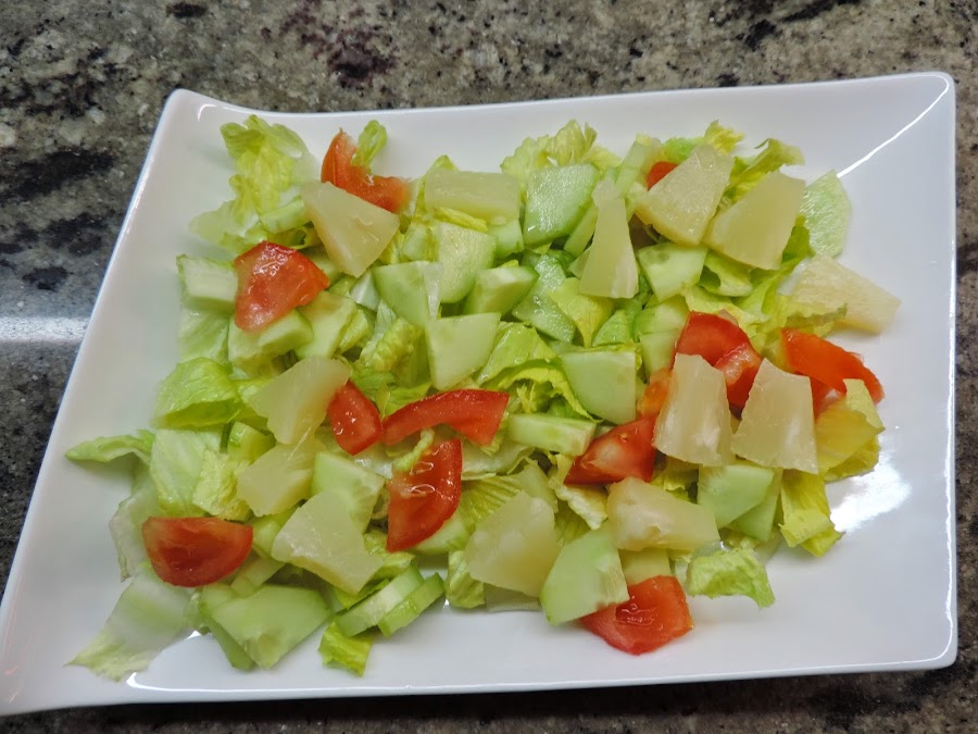 Cortamos el pepino, tomate, piña y lo añadimos a la fuente.