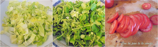 4. Ahora cortamos la lechuga en juliana y añadimos los canónigos y la rúcula. Sazonamos con sal y aliñamos con una vinagreta hecha con tres partes de aceite y una de vinagre de vino tinto.Cortamos los tomates en rodajas finitas.