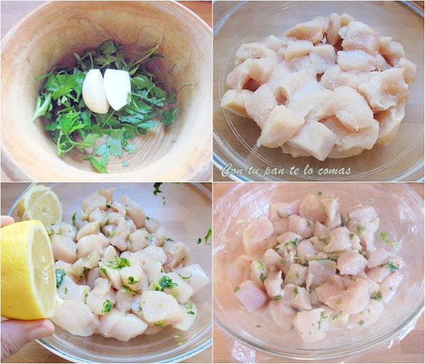 1. Majamos los dientes de ajo con un puñado de perejil fresco en el mortero. Sazonamos las pechugas cortadas en dados no muy grandes, y les añadimos el majado del mortero junto con el jugo de un limón. Tapamos el bol y dejamos en la nevera por lo menos media horita para que coja bien todo el saborcito.