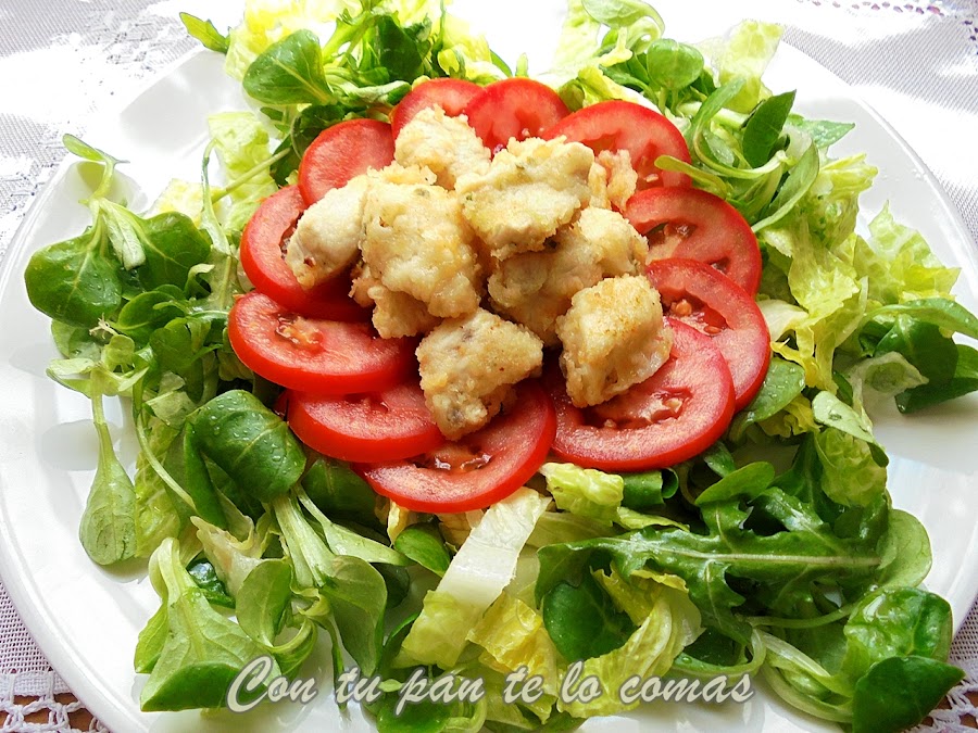 En este caso seguro que te suena esta manera de marinar el pollo porque es bastante frecuente cocinar las pechugas de esta manera, pero se me ocurrió hacerlas en dados y añadirlas a una rica ensalada de hojas verdes y tomate. Este es el resultado, una ensalada completa que sirve de plato único perfectamente a la vez que no nos derretimos en la mesa, lo que se agradece bastante.