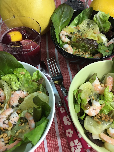 Se ponen en un bol las hojas de lechuga, los langostinos troceados y los gajos cotados de pomelo. Se espolvorean las pipas de girasol y se sazona con sal y pimienta.