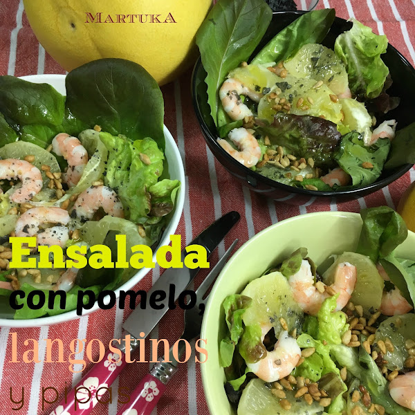 Se pelan los langostinos. Se pela el pomelo y se separan los gajos. Si se desea se puede retirar la piel que los recubre.
