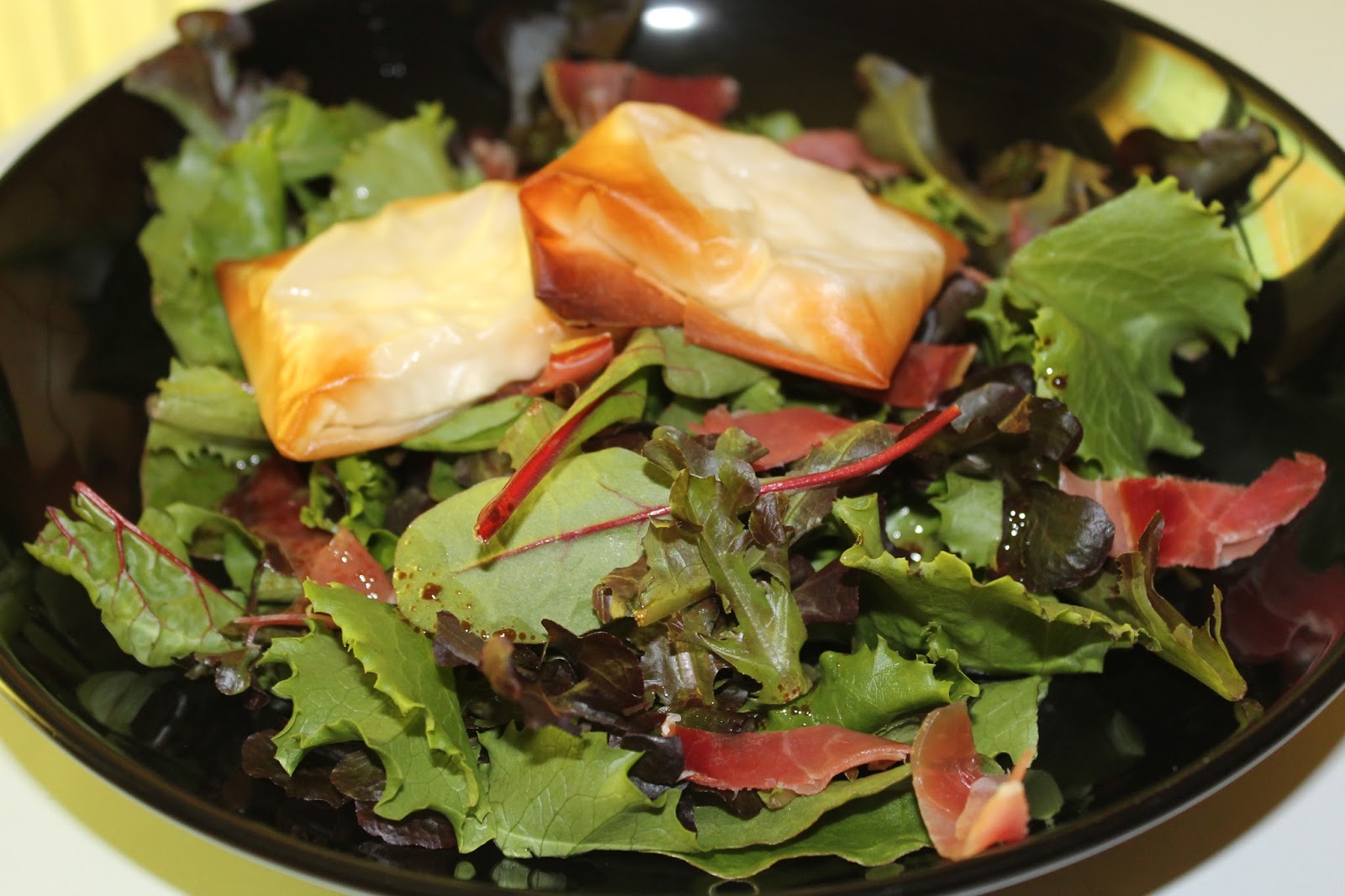 colocamos la ensalada junto al jamón, bañamos con la salsa vinagreta y servimos con el queso